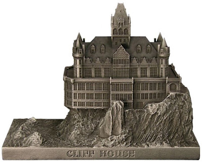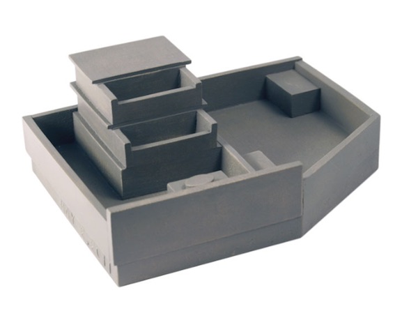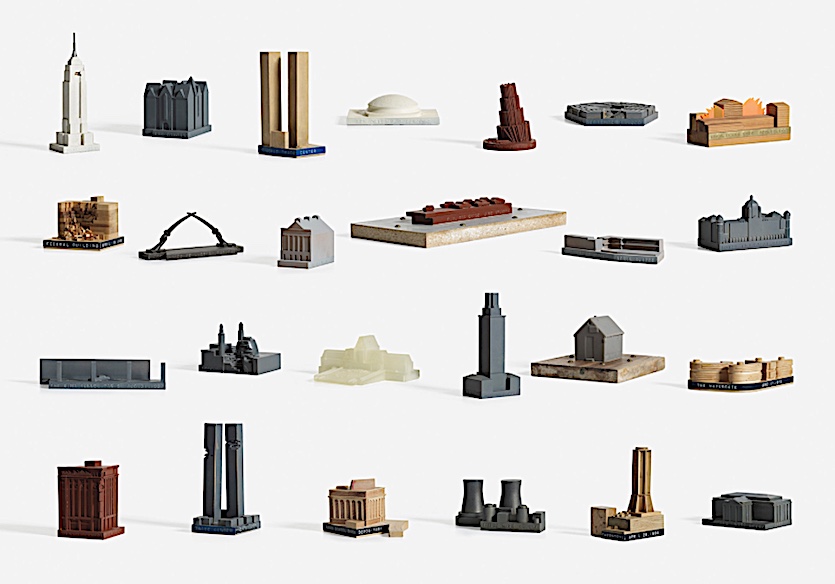 Every object is individually cast of specially formulated material, bonded metal. The building is 4.5” by 3.5” by 1.5” high. No more than 500 pieces will be made. Each one is hand-finished and consecutively numbered. Source.